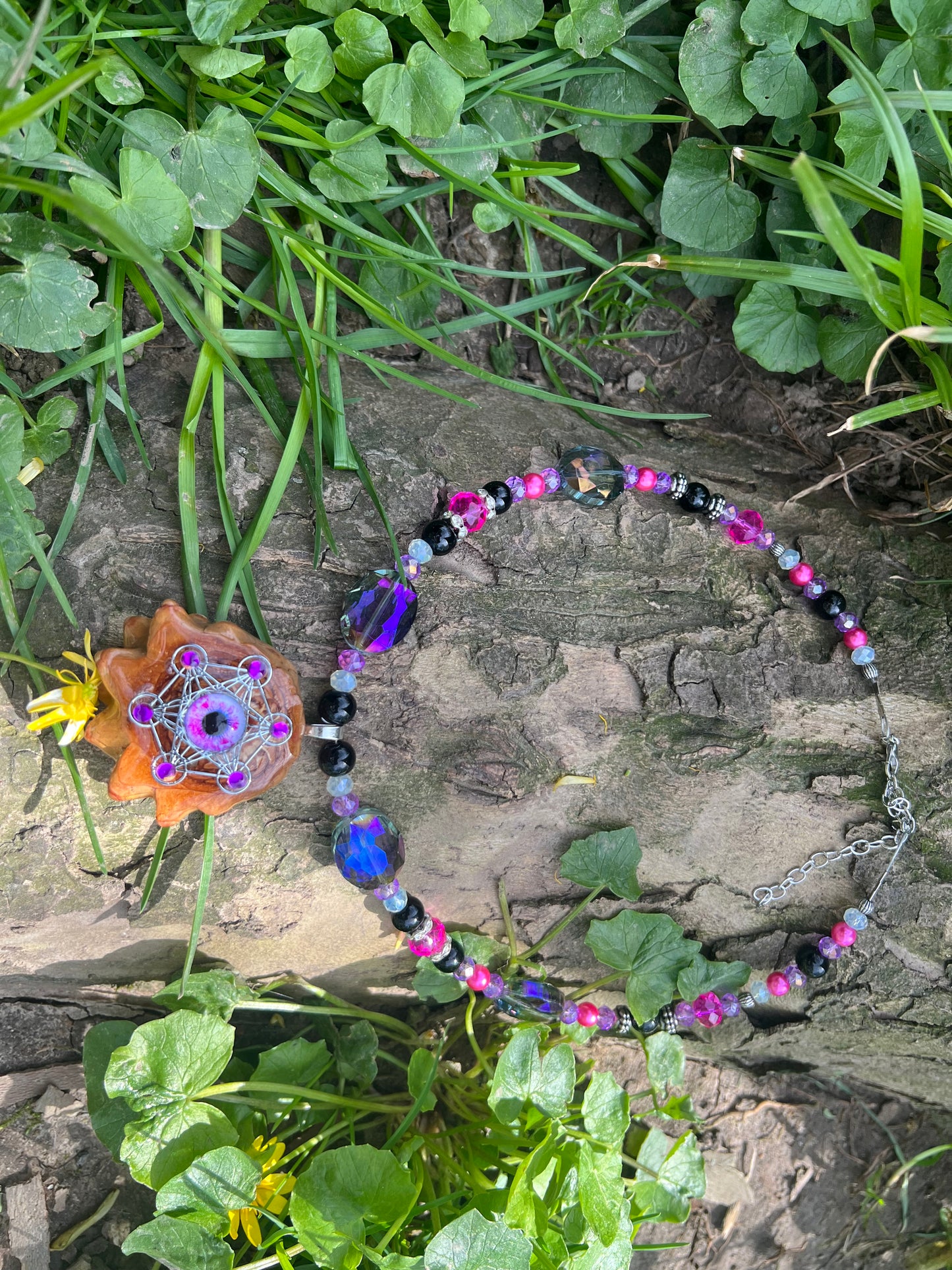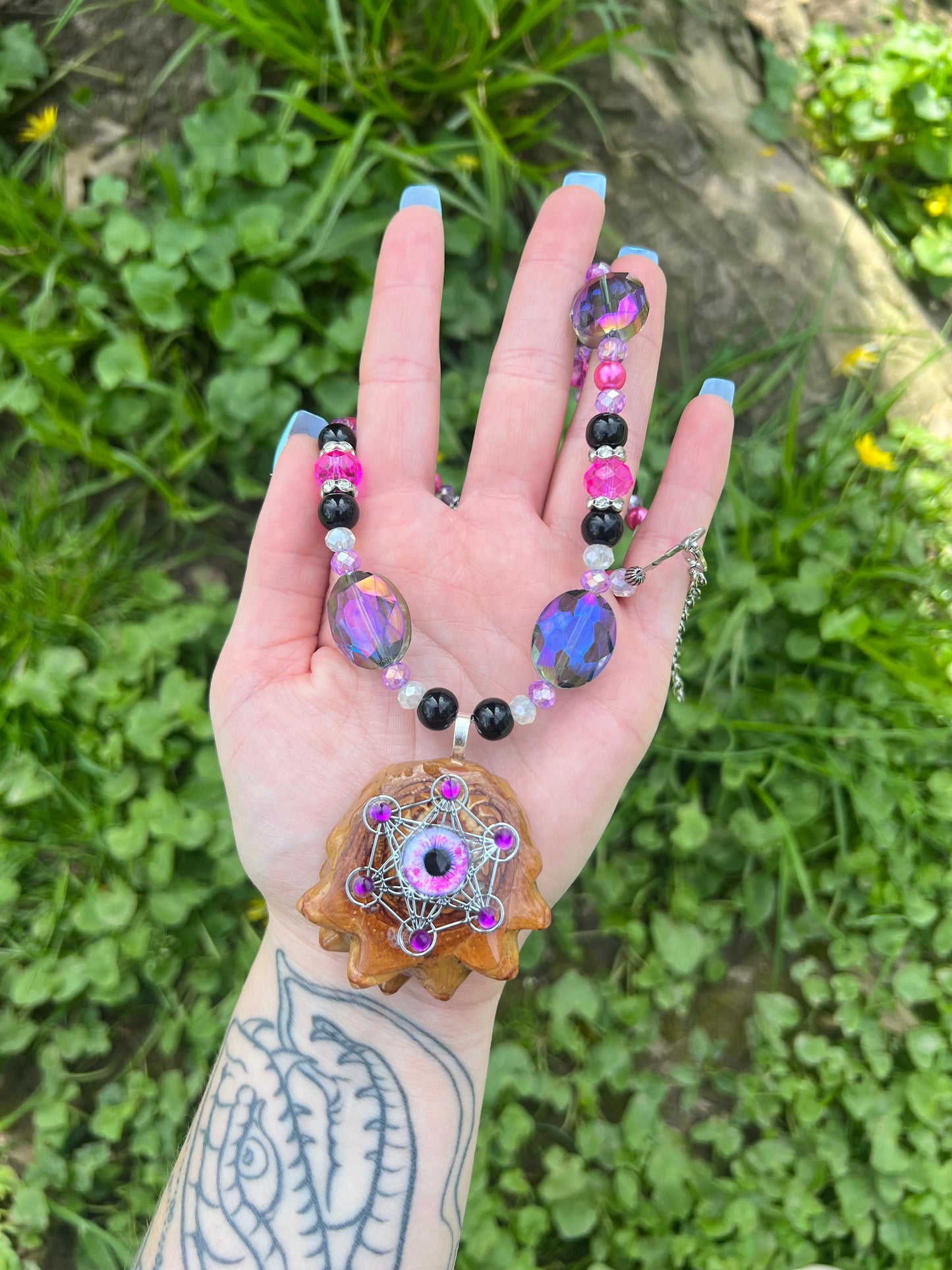 The knobcone pinecone slice is a beautiful piece of natural, it has been sanded and sealed with shellac and resin, and cured in sunlight. Please keep this pendant away from extreme temperatures for extended periods of time, as the resin can yellow or crack. The beads are a mixture of blown glass, clay and plastic. They are on a copper cord with silver plating. Comes with adjustable links and clasps to adjust the length and take on and off easily.