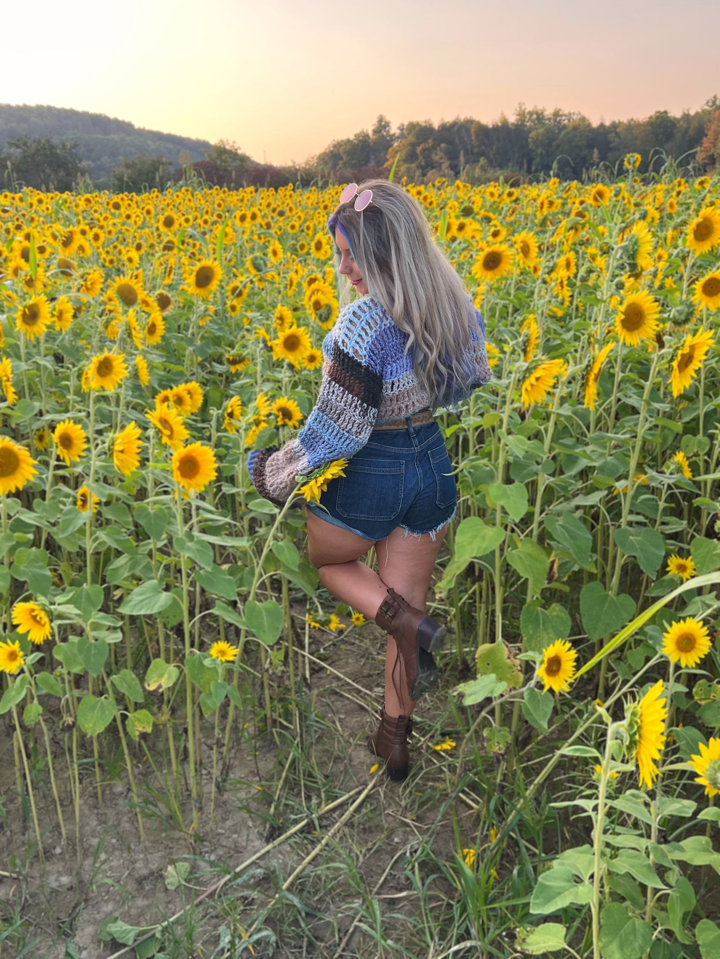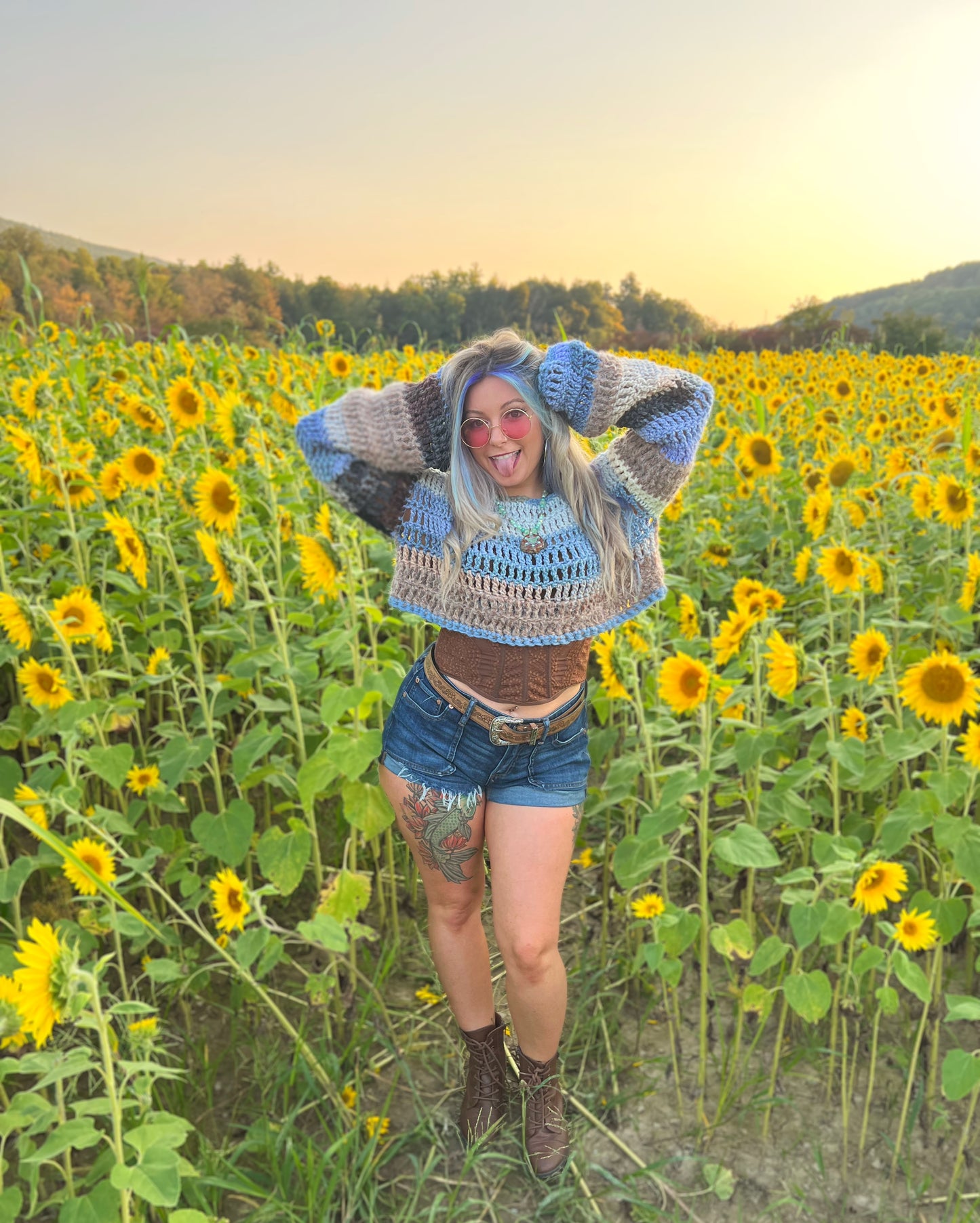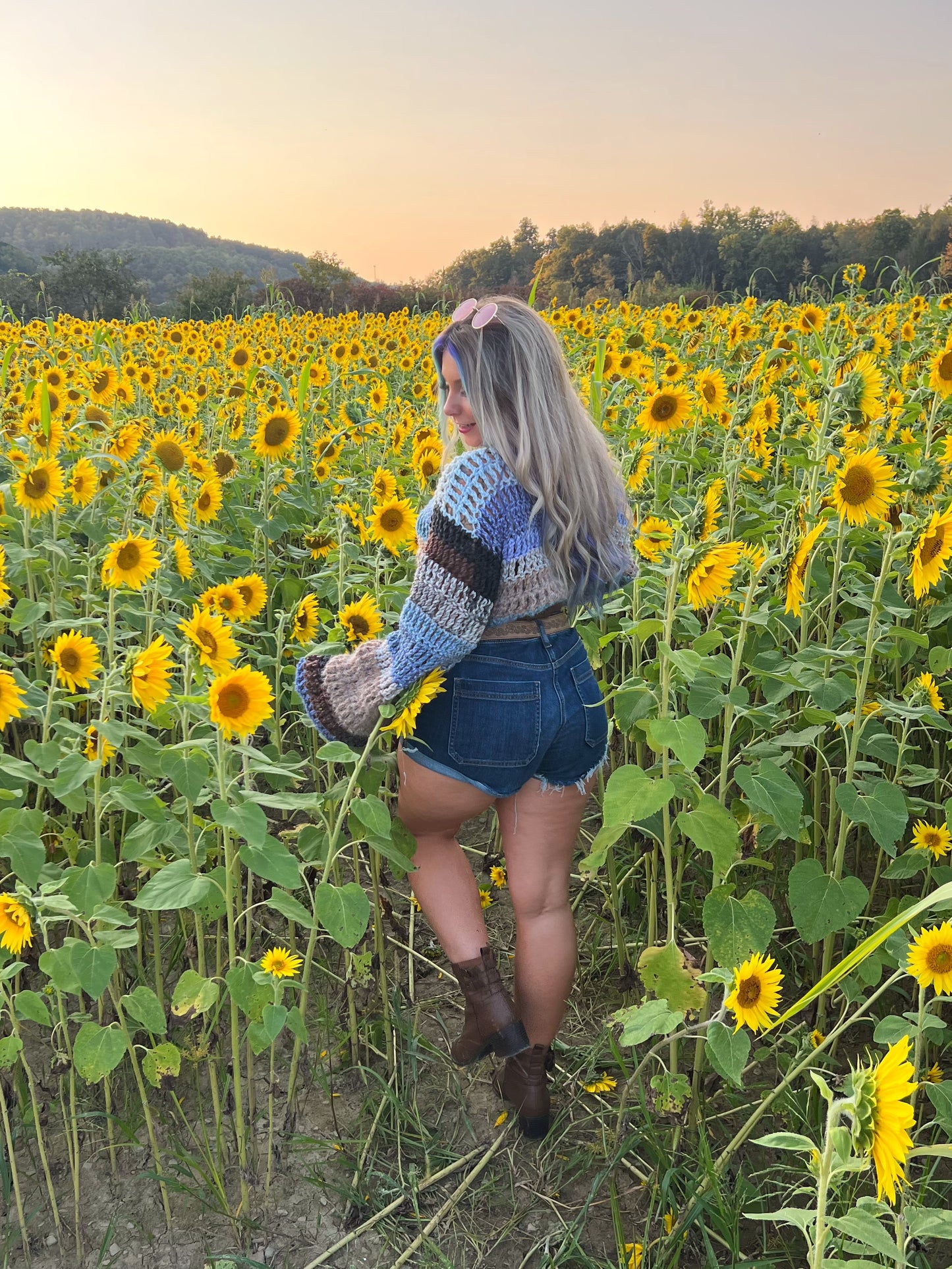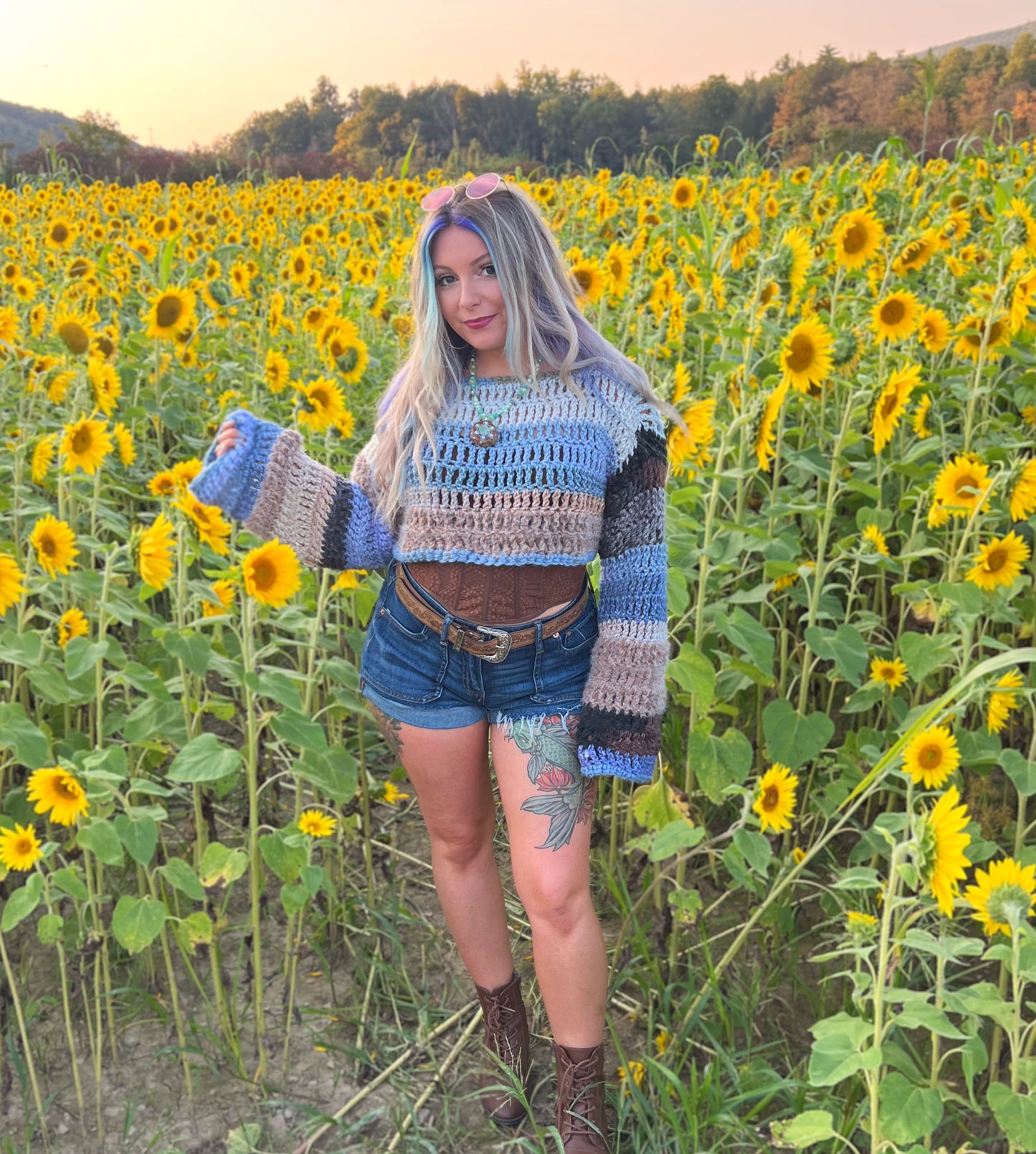 Handmade cropped weather, made with chunky scrap yarn. Acrylic and wool. Model is 5’1 and 140 pounds. Hand wash only. Lay flat to dry.