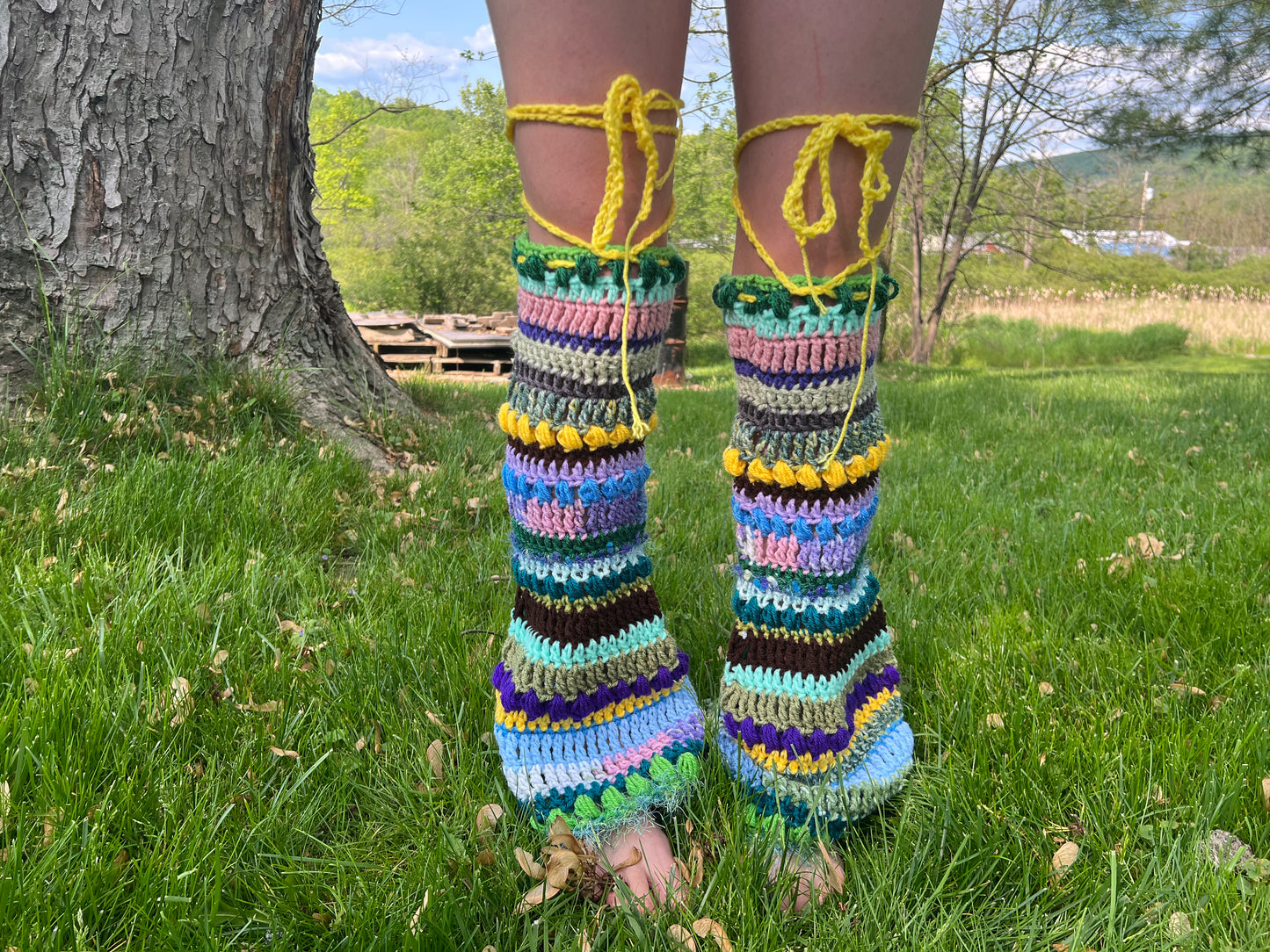 Scrappy flared leg warmers - stretchy and fits most sizes. Adjustable ties to wrap around upper legs or large bow. Hand wash only.