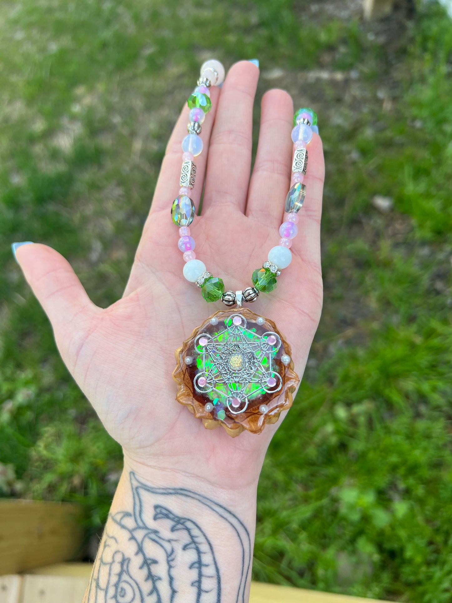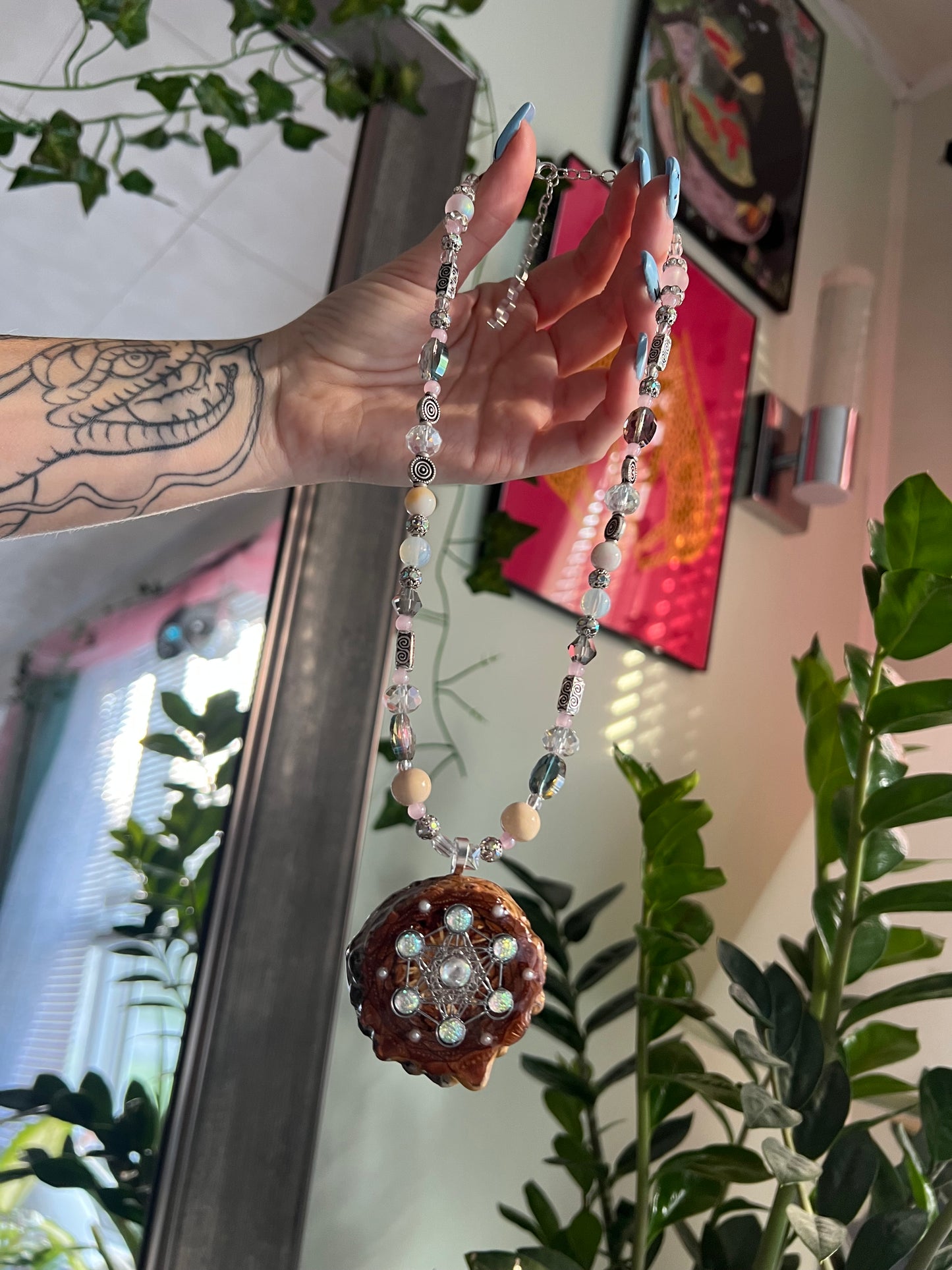 Sacred geometry pinecone with faux stones and a Metatron’s Cube silver inlay. Handmade pinecone pendant with matching beads - the pendant is actually hollowed out and filled with holographic glitter
