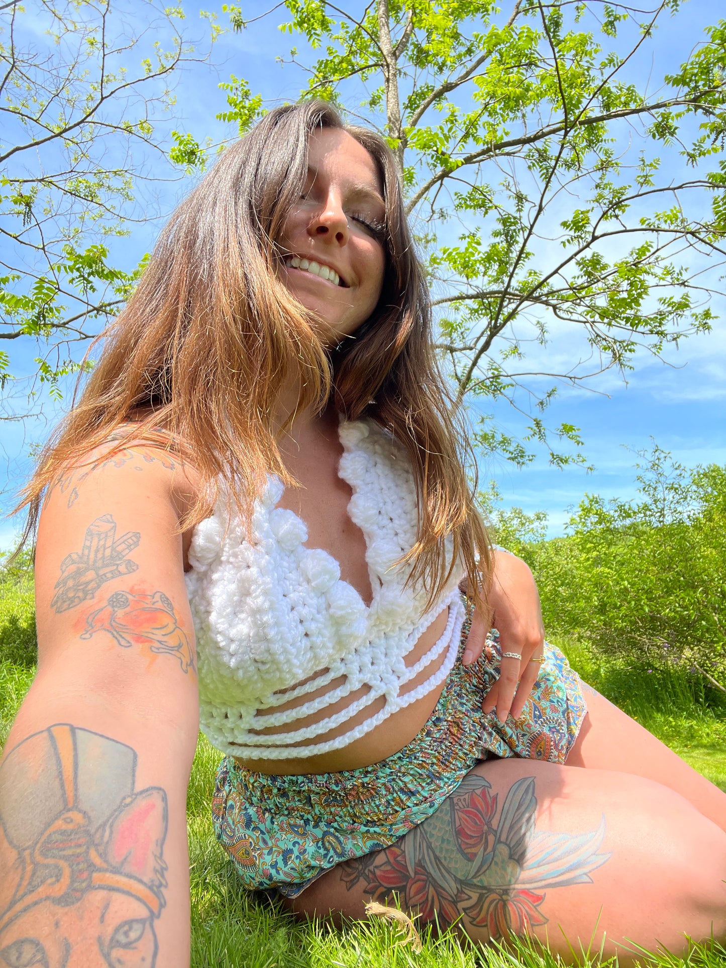 This crop top is made with a thick and chunky yarn so it will be a WARMER top. Best for night time/cooler events. I can remake this top with a thinner yarn for better comfort, however this was a tester design. Best fits medium. Ties around neck and laces up in back.