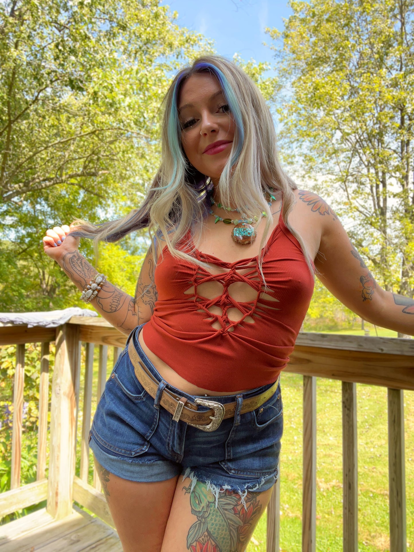 Model is 5’1 and 140 pounds. Stretchy camisole top. Slit weave only down the front middle. Hand wash only.