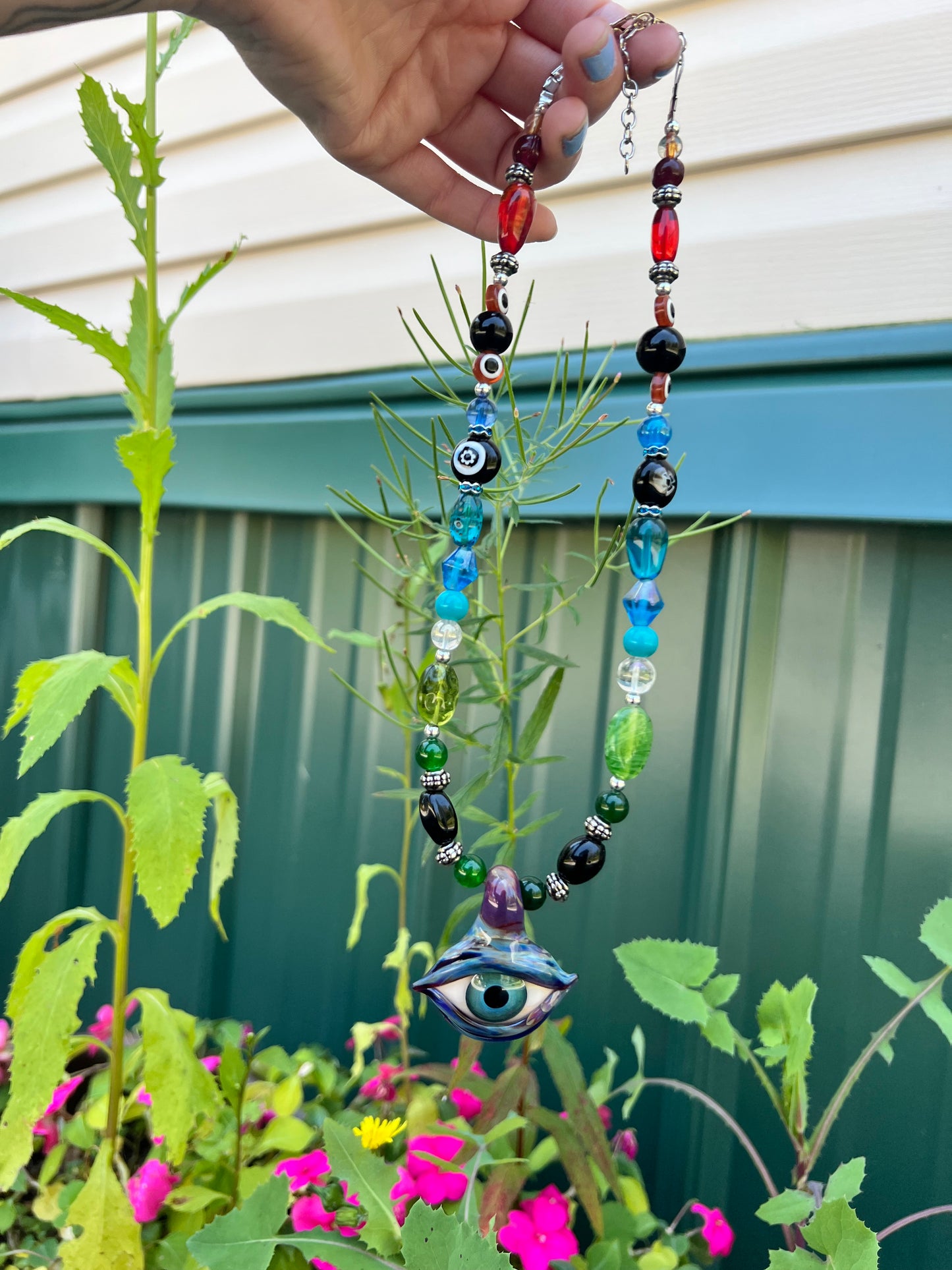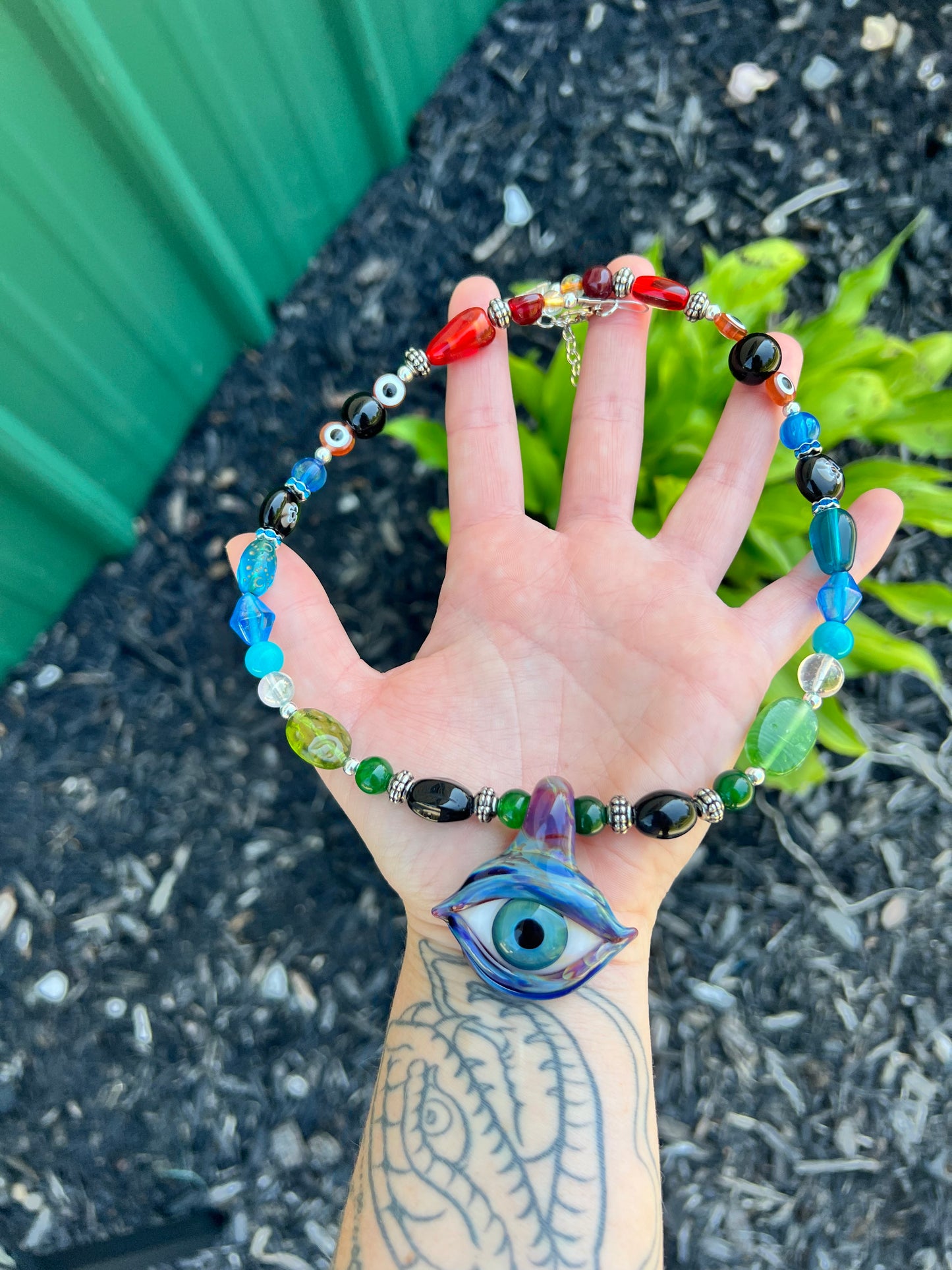 Handmade beaded necklace. Copper wire that is silver plated, with adjustable links and clasps to adjust the length and take on and off easily. Made with trippy hand blown glass eye pendant, and matching glass beads. Handle with care.