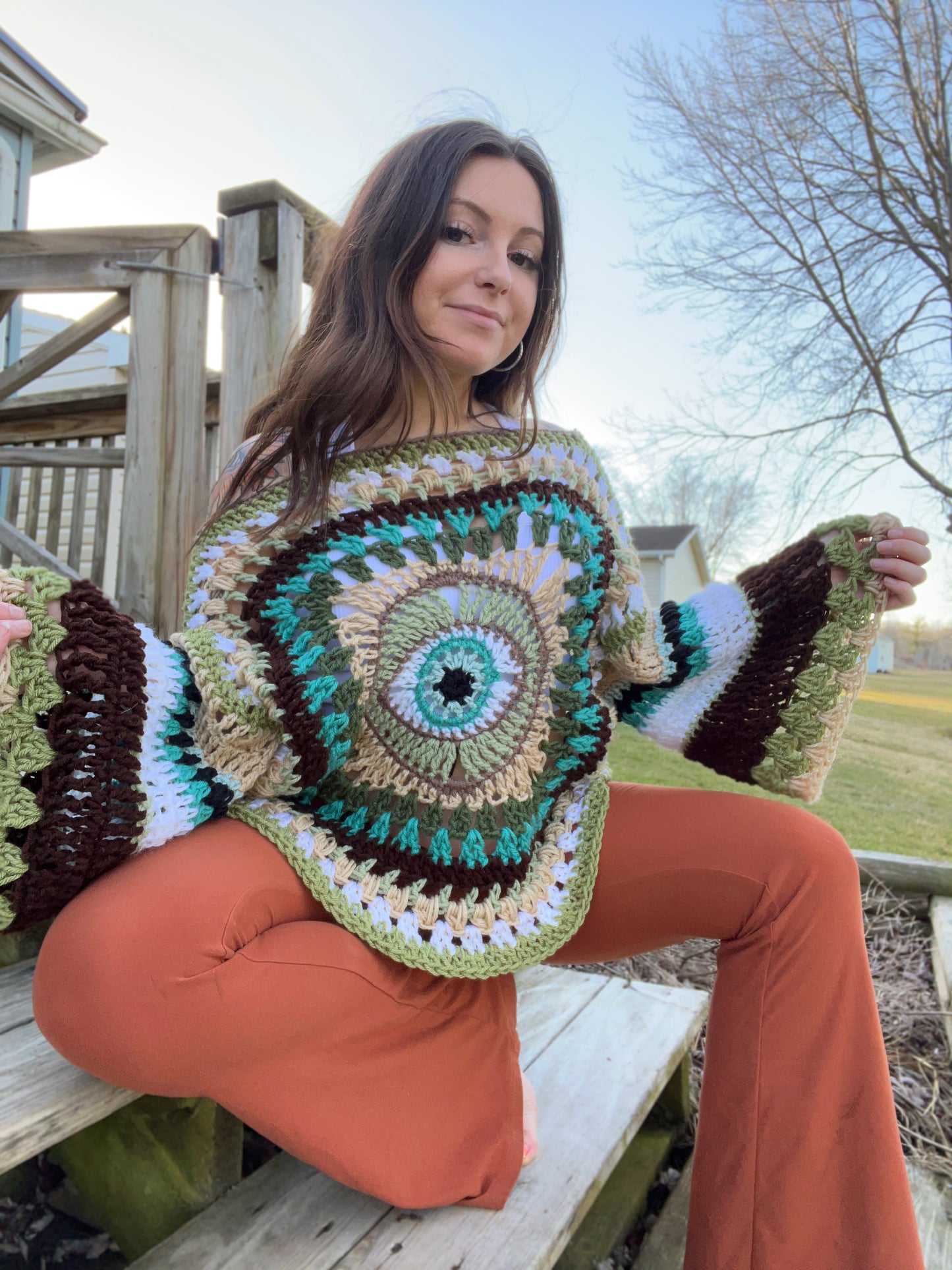 One size fits most - off-shoulder design with trippy third eye on both front and back. Large 3/4 sleeves. Model is 5’1 and 140 pounds. Hand wash, lay flat to dry.